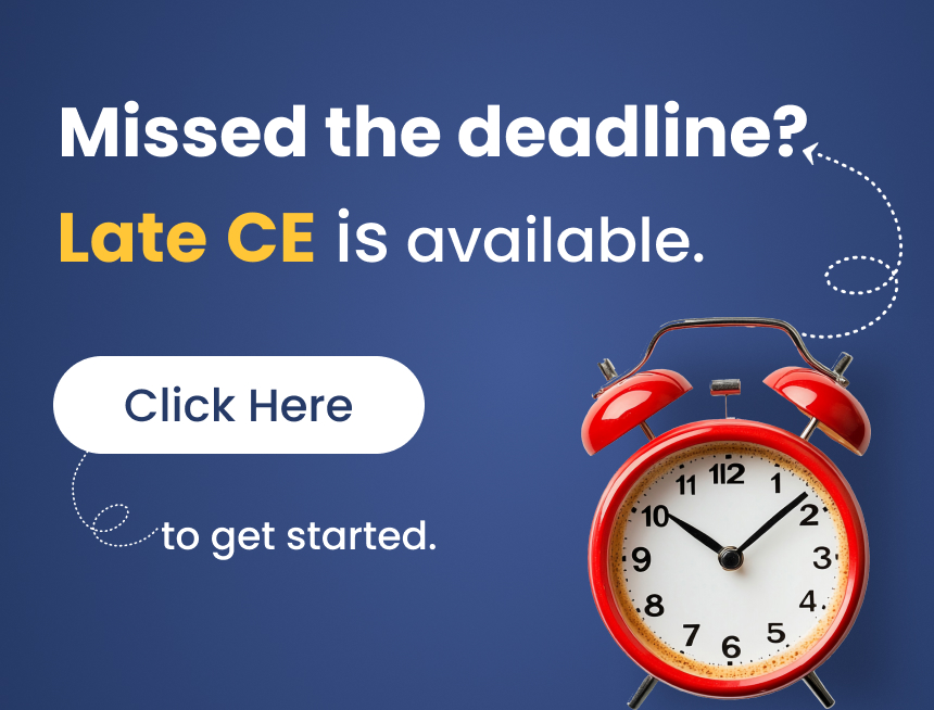 LATE CE is used for either Reinstatement or Re-Licensing only. We understand that sometimes it isn't clear whether you need LATE CE. If you find out you purchased the wrong course, that’s okay. Tell us and we will get the right course added to your account.